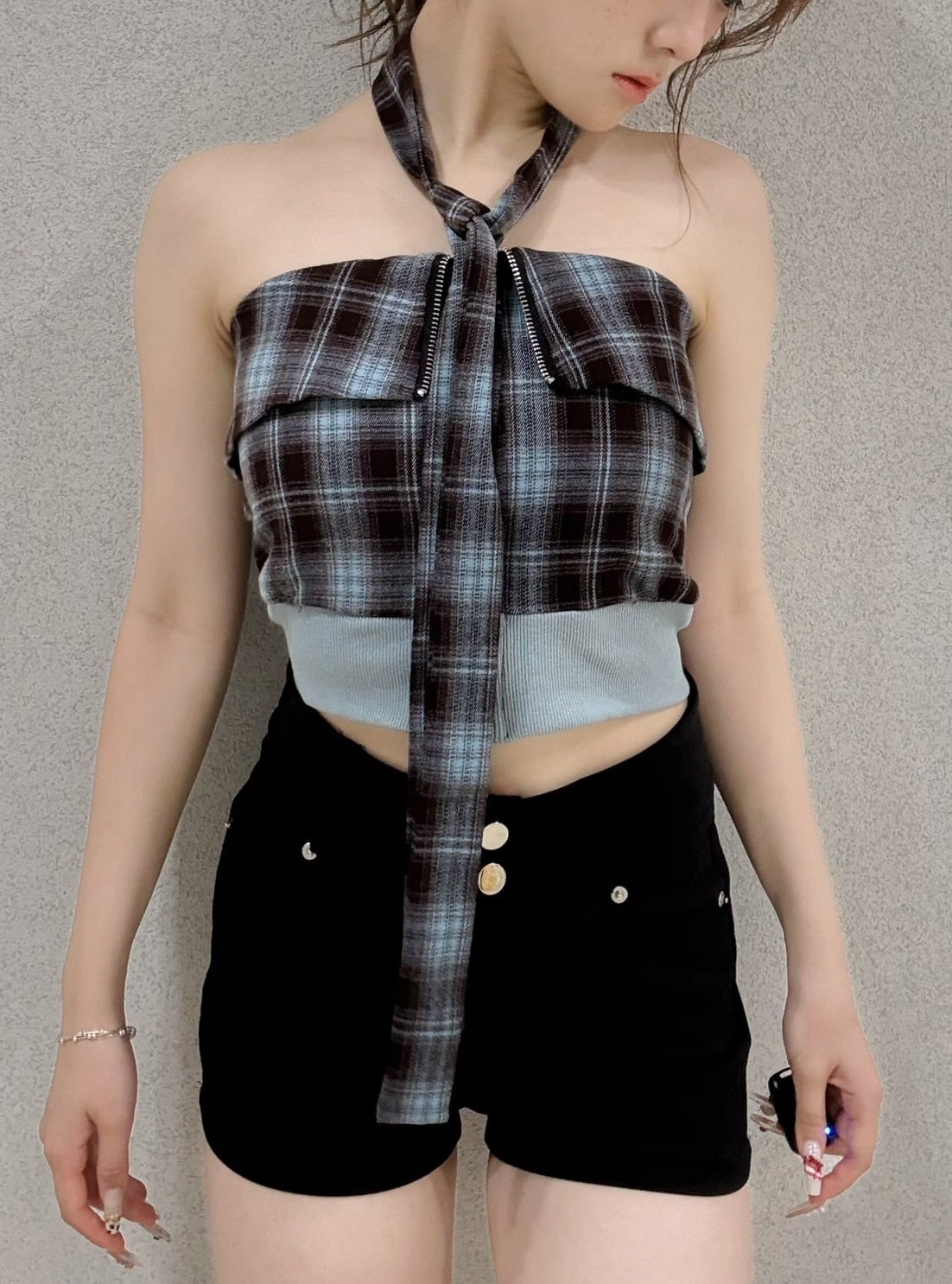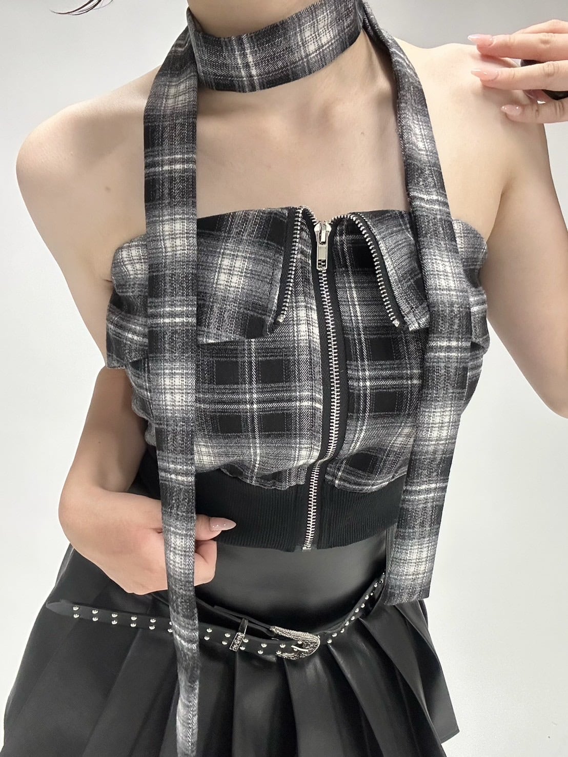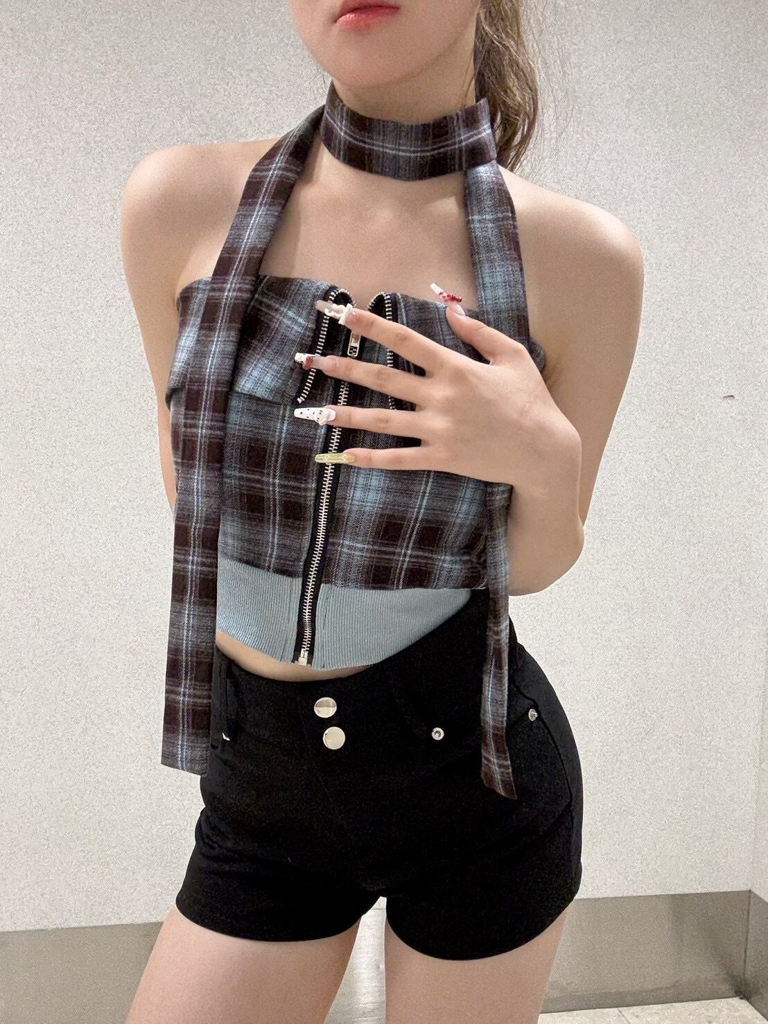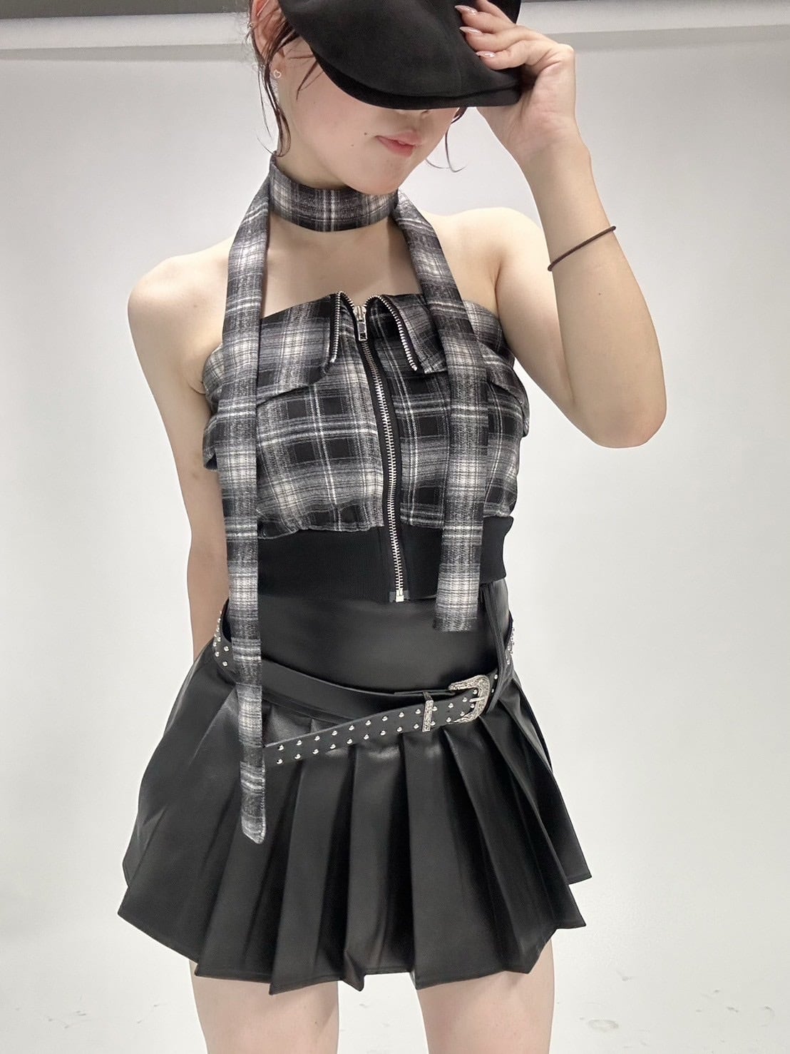 チェック柄が可愛らしいジップベアトップ、チョーカー付きでスタイリッシュ感を演出!しっかりとした素材感で、デイリーから特別な日まで幅広く活躍します。シンプルなボトムスと合わせるだけで、コーディネートが決まる優れものです。