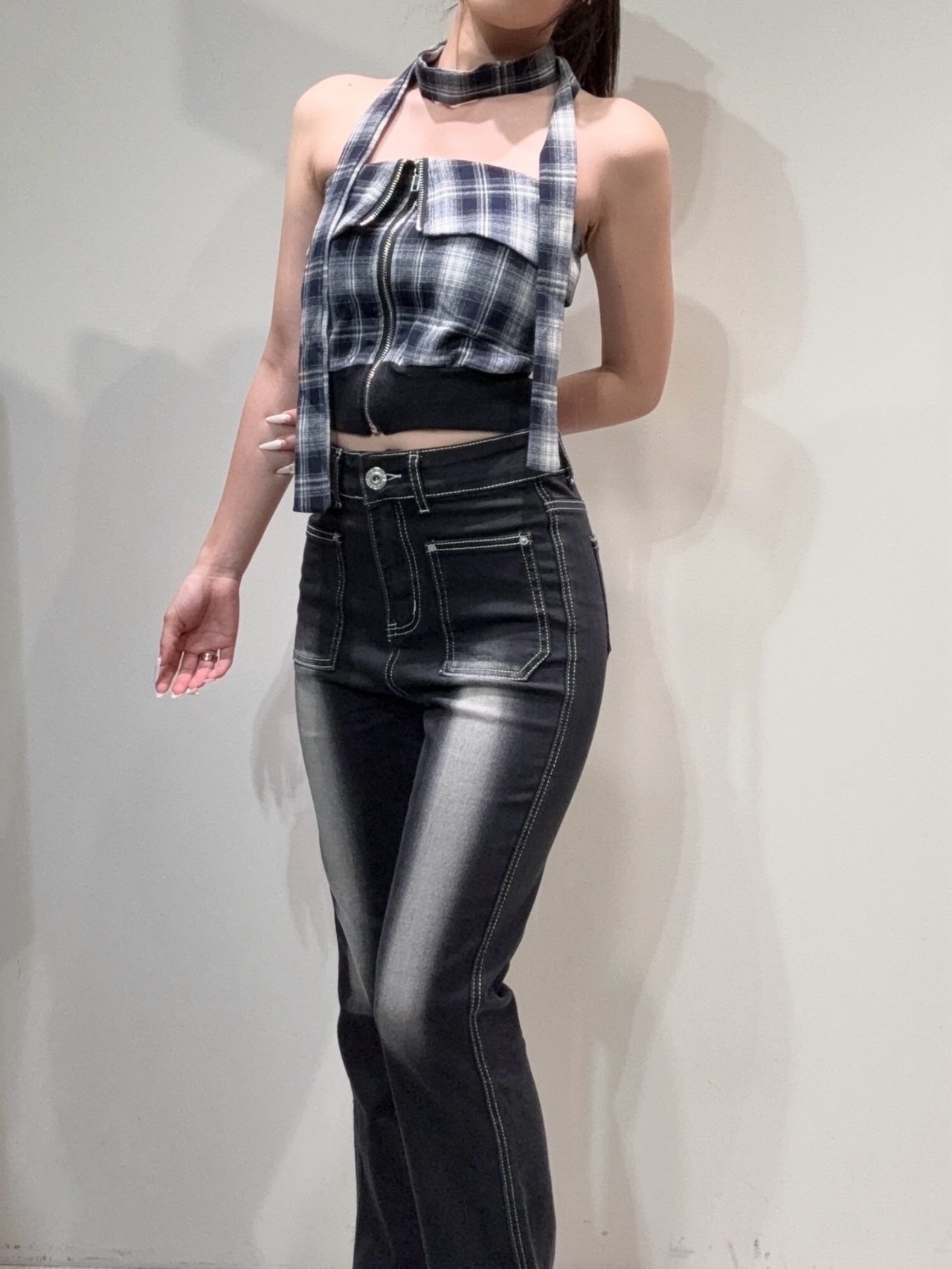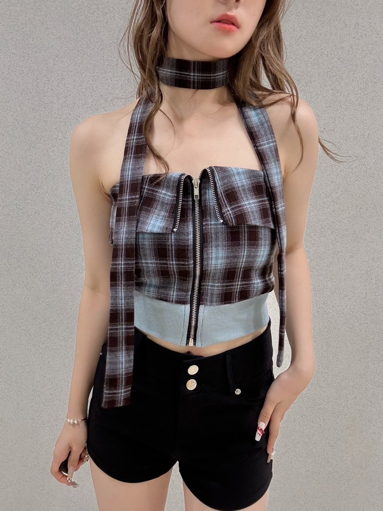 チェック柄ジップベアトップ