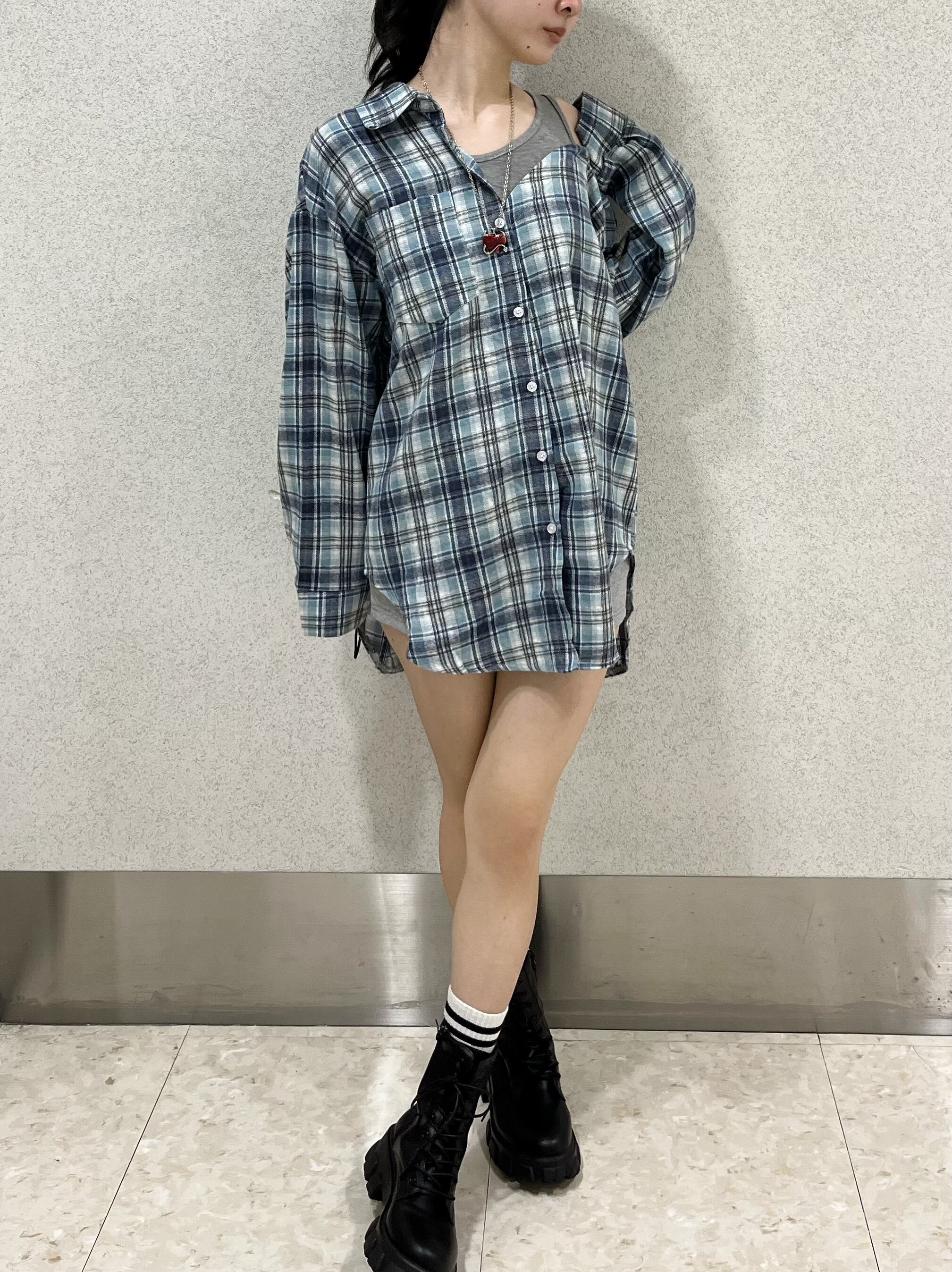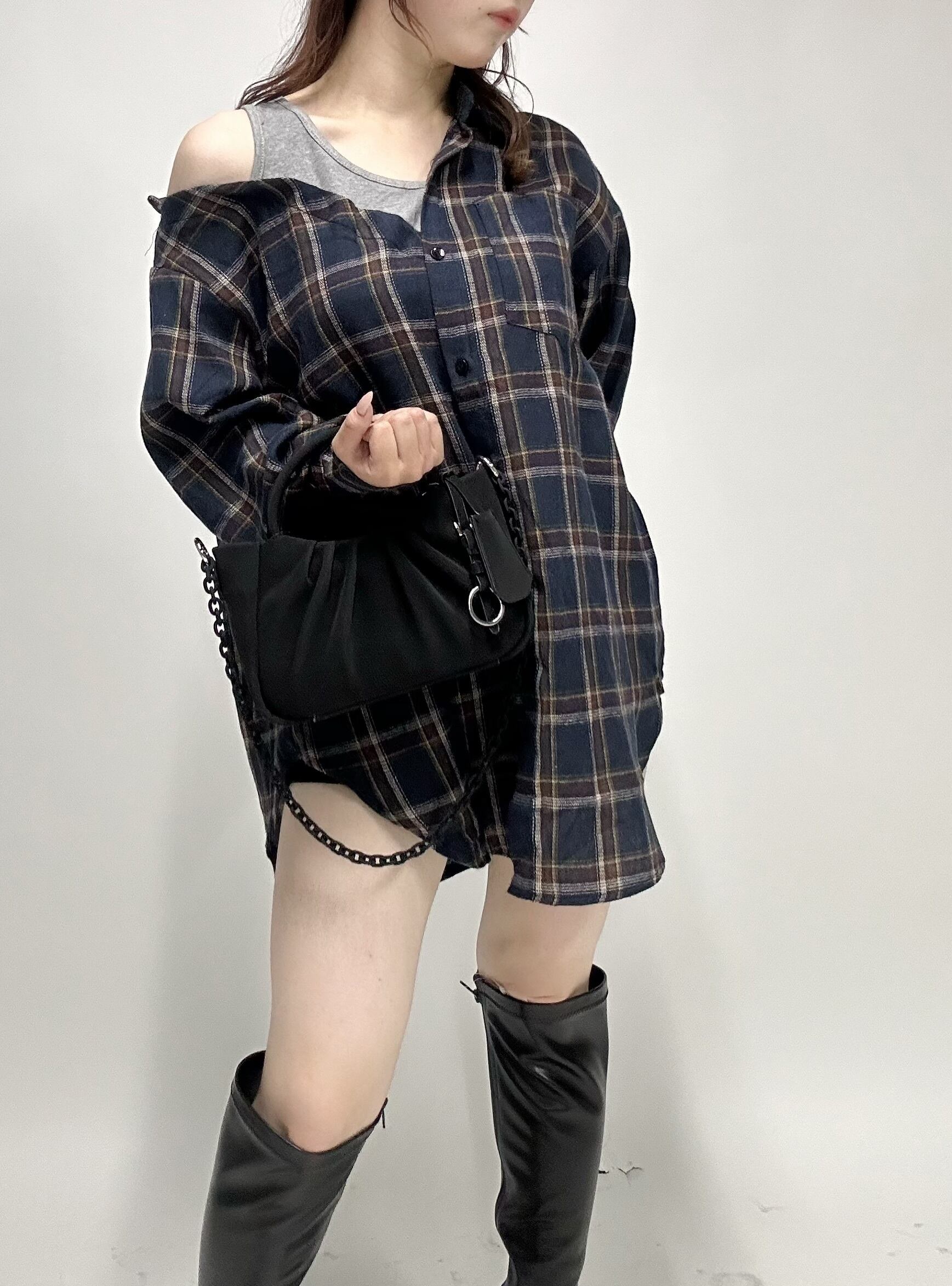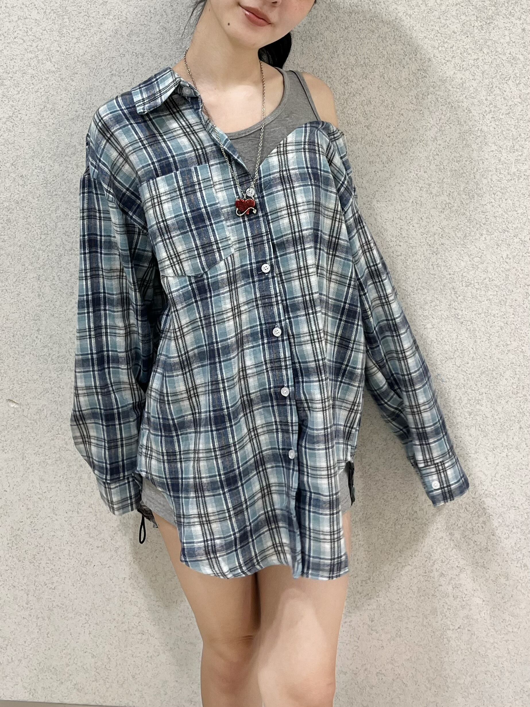 洗練されたデザインのワンショルダーチェックシャツは、トレンドを押さえたスタイルの一枚です。片方の肩を大胆に見せることで、女性らしさが際立ち、カジュアルながらも特別感のあるコーディネートを実現します。シンプルなボトムスとも相性抜群で、デイリーユースに最適なアイテムです。