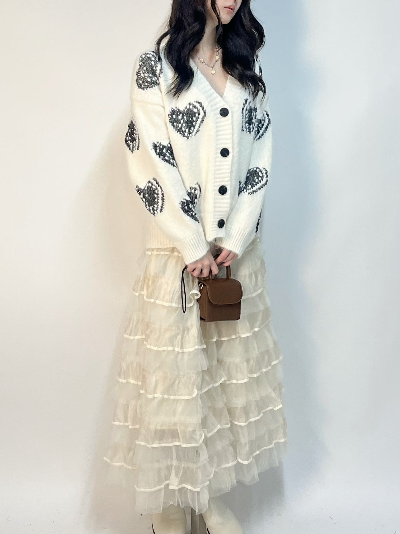 ハートニット ルーズCDは、可愛らしいハート柄と輝きのあるニット素材で、おしゃれ心をくすぐるカーディガンです。ルーズなシルエットがリラックス感を演出し、カジュアルなコーディネートにぴったりです!軽やかな肌触りで着心地も良く、デイリーから特別な日まで幅広く活躍すること間違いなし!シンプルなトップスやデニムと合わせて、こなれたスタイルを楽しんでください!