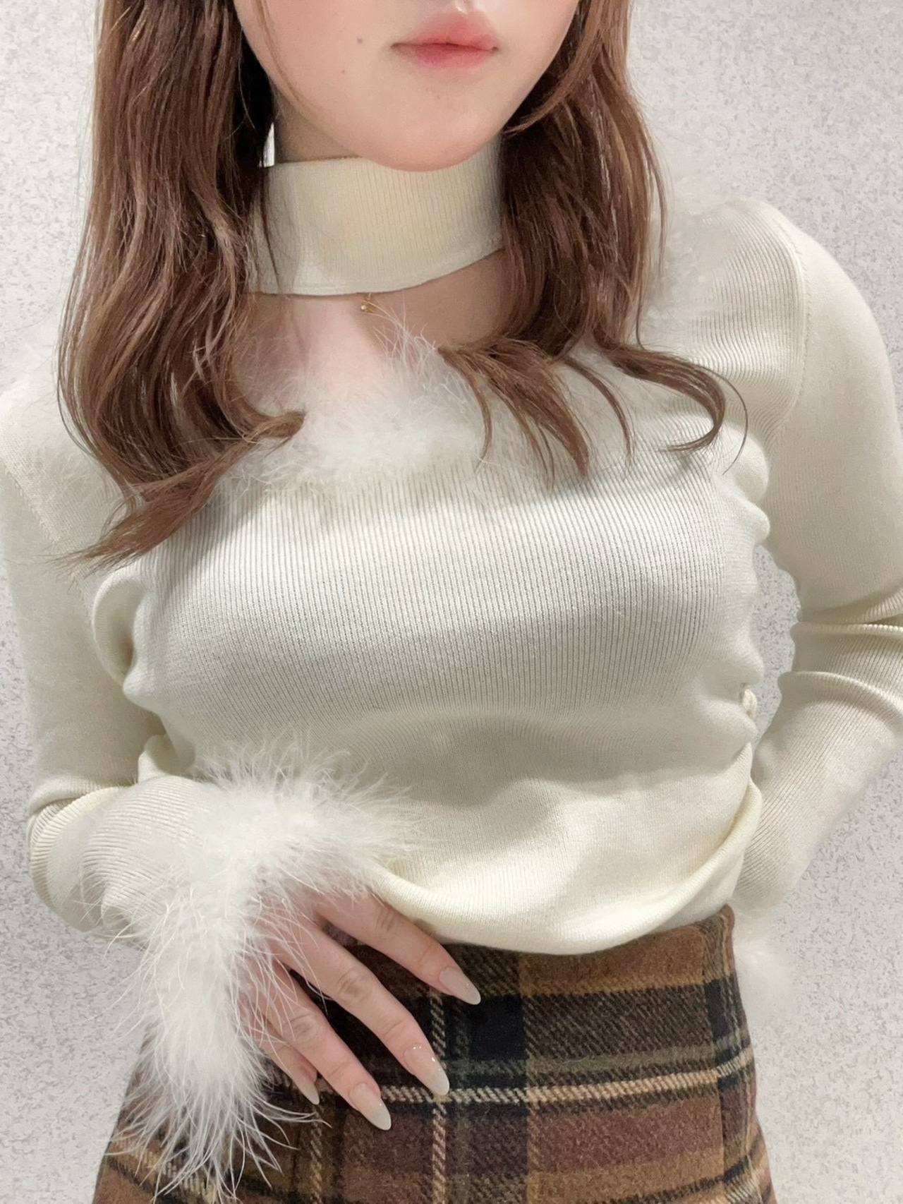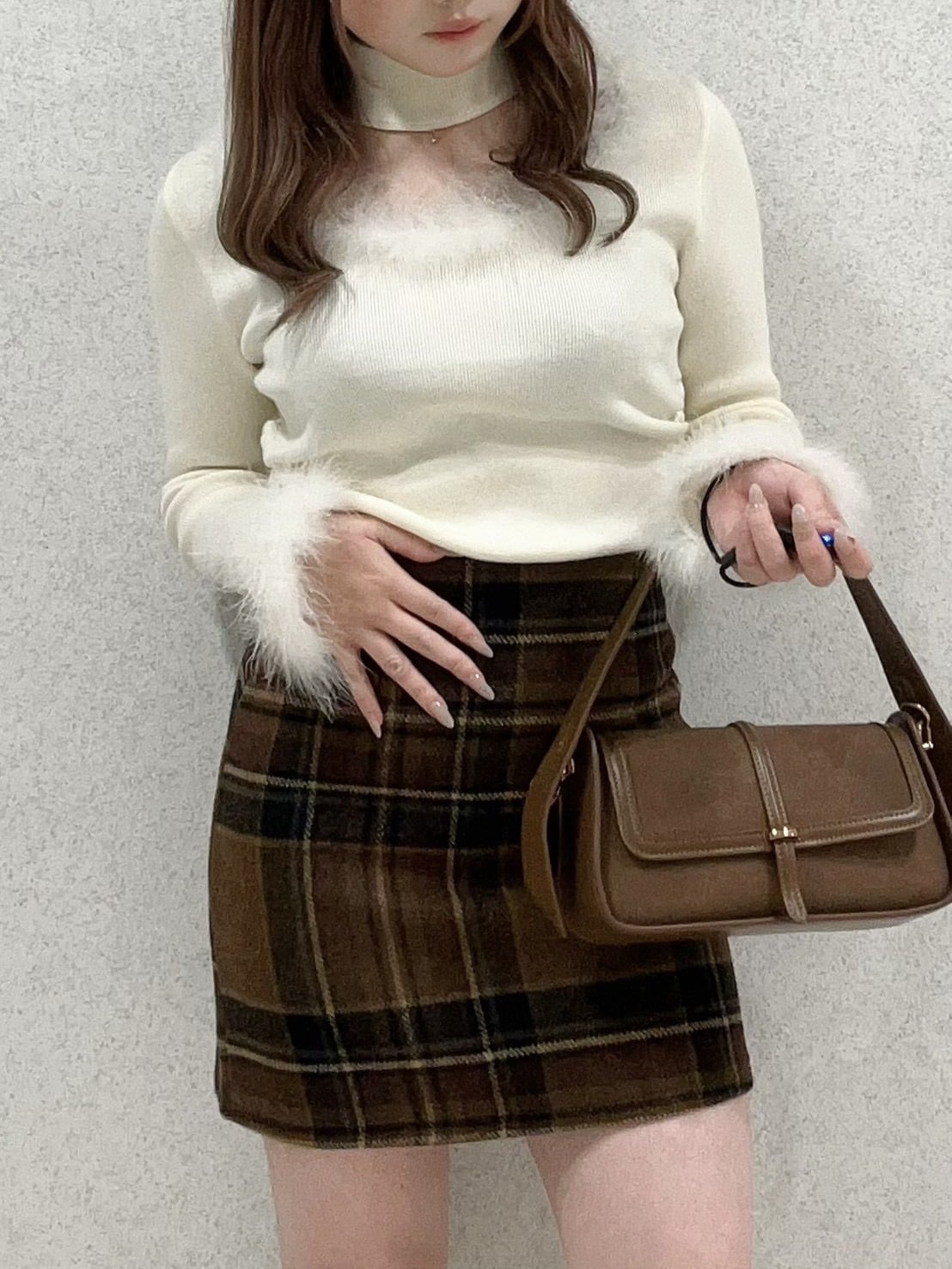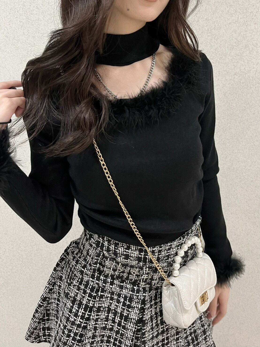 デコルテにふわっとあしらったフェザーが女性さしさを引き立てるニットトップス。