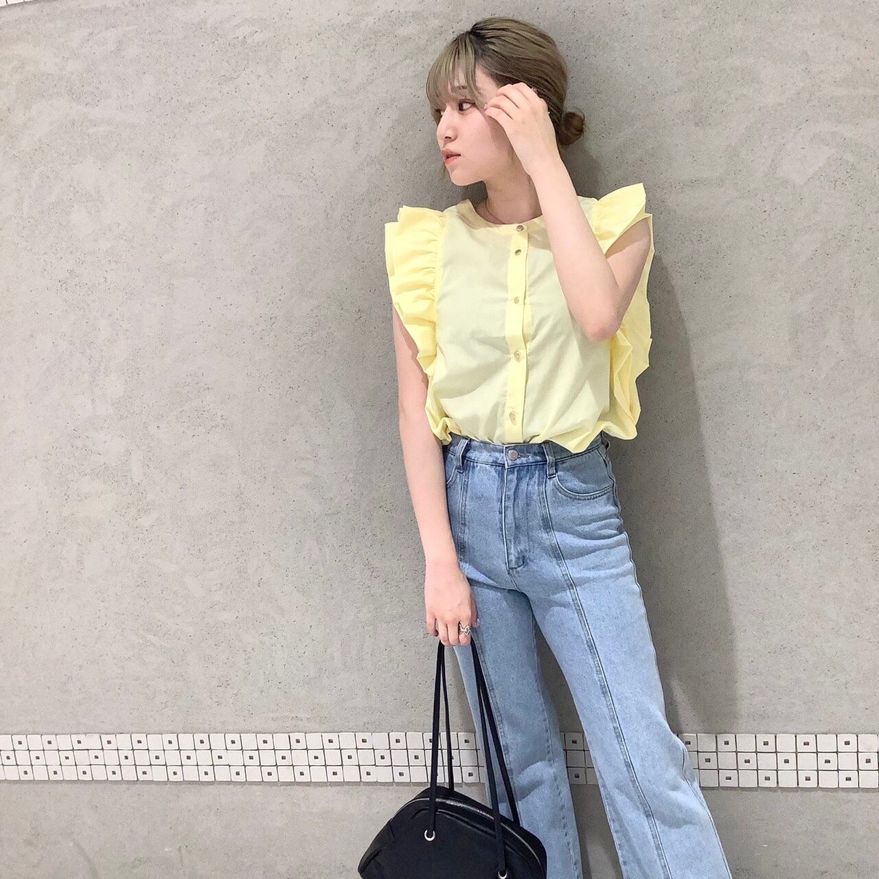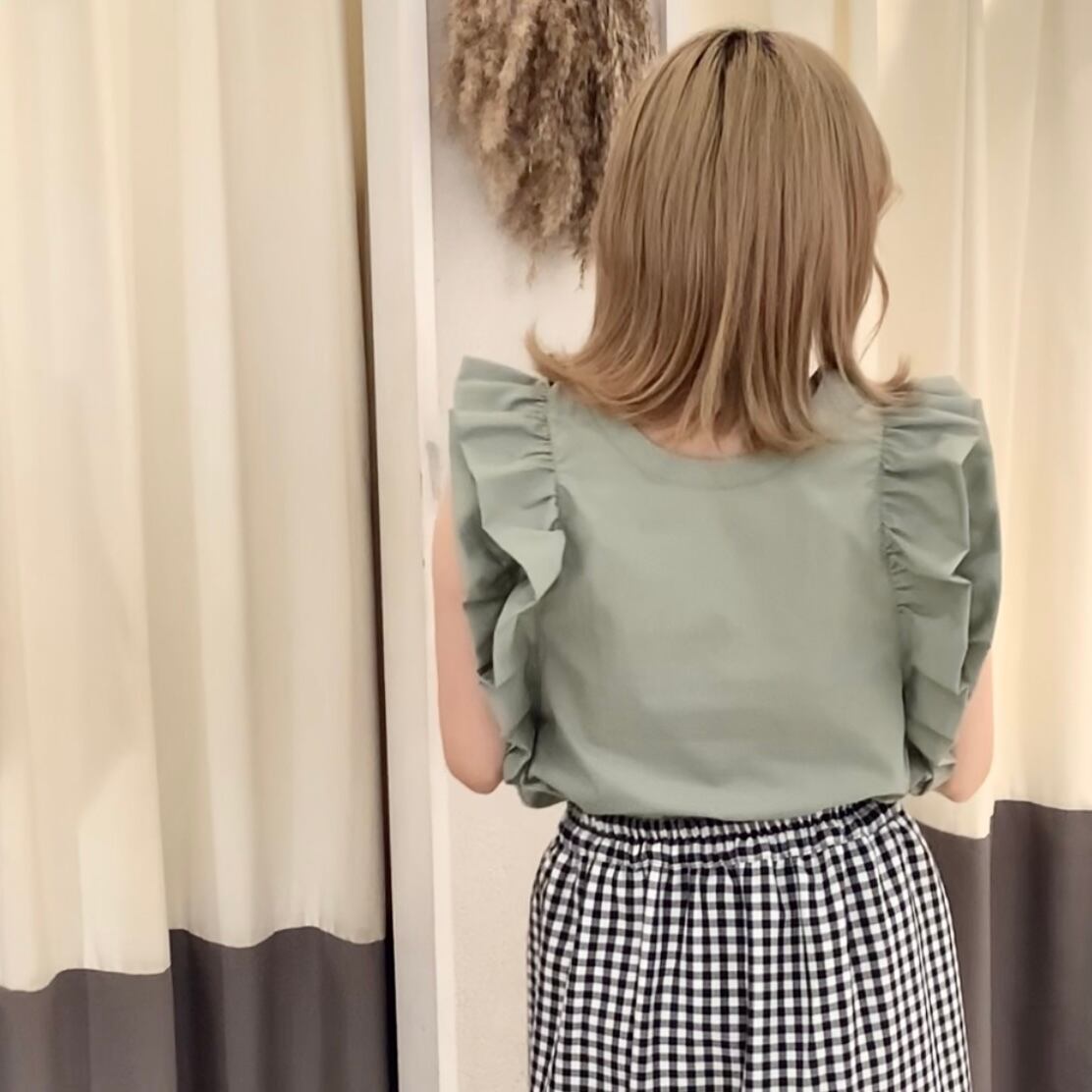 ボリュームたっぷりの袖フリルが特徴のトップス。